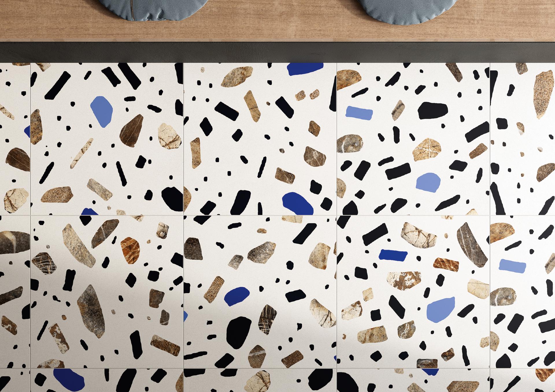 하얀 바탕에 자갈돌과 파랑색,검정색으로 구성된 포인트 타일이 눈에 쏙쏙 들어오는 제품입니다.